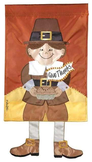 Pilgrim ‘Give Thanks’ Crazy Legs outdoor garden flag. Leg dangles add extra fun to the whimsical characters on these seasonal garden flags. Dangles are about 6″ long, appear the same on both sides and move with every breeze! The designs come to life in vivid colors. Our double sided applique flags are double the thickness and readable on both sides. They are heavier than most flags on the market and will hold up longer. They have detailed stitching and a conbination of appliqueed fabric and embroidery stitch. All of our flags are weather-resistant and feature a UV protective coating that is manufactured into the fabric. To extend the life of your flag, place them in the shade or semi-shade and your flag can last for years.