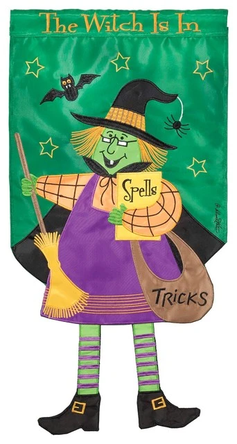 Witch Trick or Treat ‘The Witch Is In’ Crazy Legs outdoor garden flag. Leg dangles add extra fun to the whimsical characters on these seasonal garden flags. Dangles are about 6″ long, appear the same on both sides and move with every breeze! The designs come to life in vivid colors. Our double sided applique flags are double the thickness and readable on both sides. They are heavier than most flags on the market and will hold up longer. They have detailed stitching and a conbination of appliqueed fabric and embroidery stitch. All of our flags are weather-resistant and feature a UV protective coating that is manufactured into the fabric. To extend the life of your flag, place them in the shade or semi-shade and your flag can last for years.